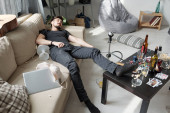 Zdjęcie "Pijany alkoholik wyczerpany po zabawnej imprezie śpiący z pustym szkłem na podłodze w brudnym mieszkaniu" może być wykorzystywane do celów osobistych i komercyjnych zgodnie z warunkami zakupionej licencji Royalty-free. Obraz jest dostępny do pobrania w jakości wysokiej rozdzielczości do 5760x3840.