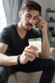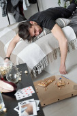 Pijany alkoholik wyczerpany po zabawnej imprezie śpiący z pustym szkłem na podłodze w brudnym mieszkaniu