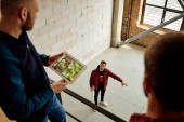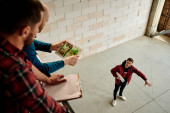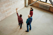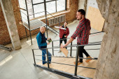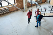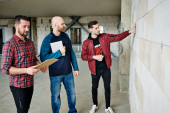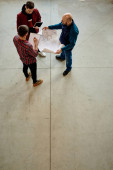 Zdjęcie "Grupa młodych współczesnych inżynierów omawia szkic w planie posiadanym przez jednego z nich, konsultując pewne szczegóły" może być wykorzystywane do celów osobistych i komercyjnych zgodnie z warunkami zakupionej licencji Royalty-free. Obraz jest dostępny do pobrania w jakości wysokiej rozdzielczości do 5760x3840.