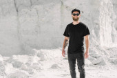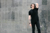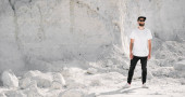 Hipster przystojny mężczyzna model noszenie biały pusty t-shirt z miejscem na logo lub projekt w swobodnym stylu miejskim