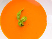 Smaczna zupa z dyni ze świeżymi liśćmi bazylii, zmieszana z przyprawą i cebulą. Widok z góry, zbliżenie.