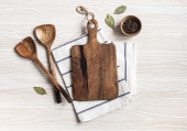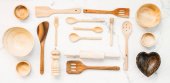 Płaskie ułożenie różnych drewnianych naczyń kuchennych na jasnym tle. widok z góry