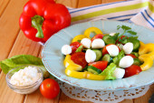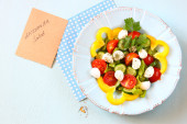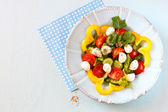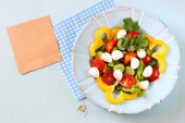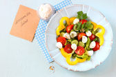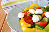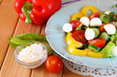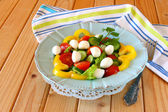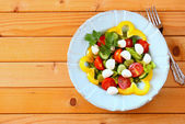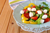 나무 테이블 배경에 신선한 야채와 모 짜 렐 라 샐러드.