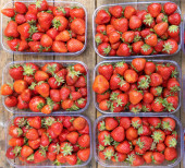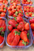 Dojrzałe czerwone truskawki w plastikowych pudełkach. Sprzedaż świeżych upraw jagód na targu rolniczym.