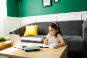 Zdjęcie "Cute biały maluch noszenie ciężkich telefonów i śmiech podczas oglądania czegoś zabawnego na laptopie w domu" może być wykorzystywane do celów osobistych i komercyjnych zgodnie z warunkami zakupionej licencji Royalty-free. Obraz jest dostępny do pobrania w jakości wysokiej rozdzielczości do 5760x3840.