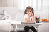 Portret pięknej białej dziewczynki, gotowej do szkoły w domu i uśmiechniętej