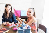 Portret uroczej kobiety podnoszącej kciuki i odnoszącej sukcesy w nauce w domu