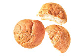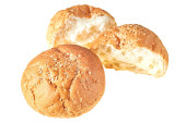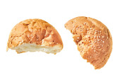 Dwie połówki łamane smaczne miękkie świeże okrągłe bułki z nasionami sezamu do hamburgera, cheeseburgera lub gotowania innych hamburgerów. Odizolowany na białym tle. Zbliżenie