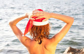 kobieta w Boże Narodzenie kapelusz zapraszając do morza