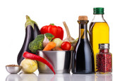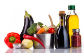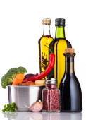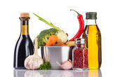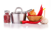garnek ze stali nierdzewnej z warzywami na białym tle