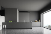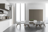 Zdjęcie "Wnętrze nowoczesnej kuchni z białymi ścianami, betonową podłogą, beżowymi szafkami, białymi blatami, barem ze stołkami i białym stołem z fotelami. Rozmyty widok na góry. 3d renderowanie" może być wykorzystywane do celów osobistych i komercyjnych zgodnie z warunkami zakupionej licencji Royalty-free. Obraz jest dostępny do pobrania w jakości wysokiej rozdzielczości do 5760x3840.