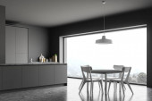 Wnętrze nowoczesnej kuchni z białymi ścianami, betonową podłogą, beżowymi szafkami, białymi blatami, barem ze stołkami i białym stołem z fotelami. Rozmyty widok na góry. 3d renderowanie