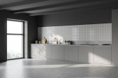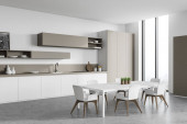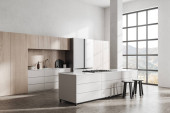 Zdjęcie "Wnętrze nowoczesnej kuchni z białymi ścianami, betonową podłogą, białymi blatami, beżowymi szafkami i plakatem z nowojorskim pejzażem. 3d renderowanie" może być wykorzystywane do celów osobistych i komercyjnych zgodnie z warunkami zakupionej licencji Royalty-free. Obraz jest dostępny do pobrania w jakości wysokiej rozdzielczości do 5760x3840.
