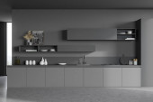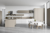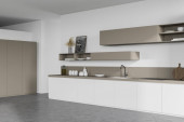 Wnętrze nowoczesnej kuchni z białymi ścianami, betonową podłogą, białymi blatami, beżowymi szafkami i plakatem z nowojorskim pejzażem. 3d renderowanie