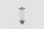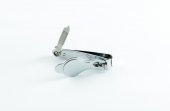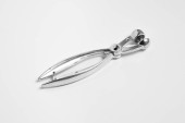 Metalowa prasa do czosnku na białym tle. Fotografia wysokiej rozdzielczości.Widok z góry.