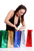 portret jeden szczęśliwy młody dorosły dziewczyna z kolorowych worków