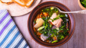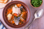 Prosta zupa rybna z łososiem i warzywami w glinianej misce