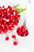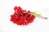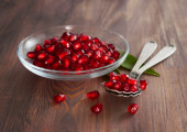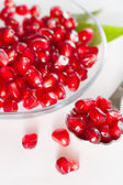 Fresh granaty dojrzałe nasiona na płytce szklanej. drewniane tła