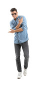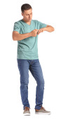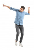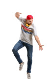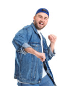 African-American nastolatek taniec i słuchanie muzyki na białym tle