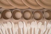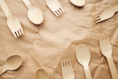 Góra nad głową widok zdjęcie drewniane sztućce leżące bokiem czyniąc centrum puste izolowane na tle papieru rzemieślniczego