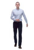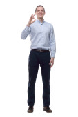 uśmiechnięty mężczyzna w niebieską koszulę i jeanse na białym tle na biały deseń