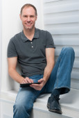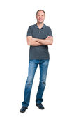 uśmiechnięty mężczyzna w niebieską koszulę i jeanse na białym tle na biały deseń