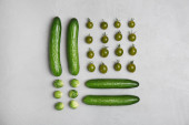 Świeże ogórki i pomidory wiśniowe na szarym, betonowym stole. Zamknij drzwi. Puste miejsce. Widok z góry.