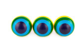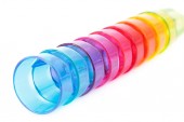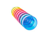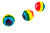 Trzy kolorowe gumowe kulki w paski izolowane na białym tle.