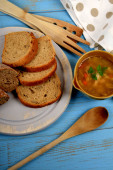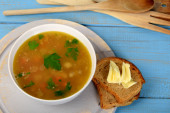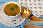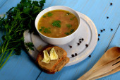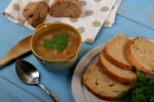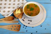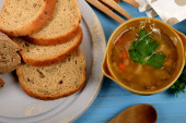 smaczne flaczki zupy w małej misce obok suchego chleba