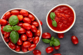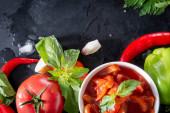ketchup z gałązką zielonej Bazylii, plasterki pomidorów, czerwony pieprz chili, czosnek na czarnym tle, widok z góry sosu,
