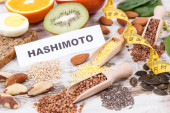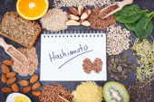 Notatnik z napisem hashimoto, miara taśmy i najlepsze składniki odżywcze lub produkty dla zdrowej tarczycy
