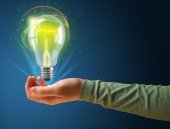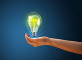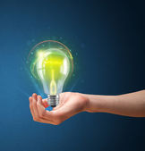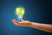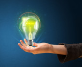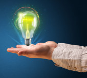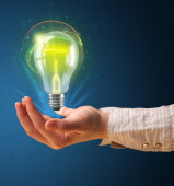 Świecąca żarówka w ręku kobiety