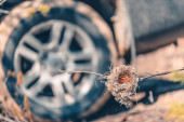 Banda dojrzałych bananów w rurze wydechowej samochodu