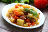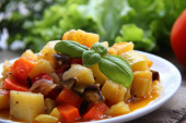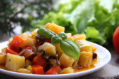 Gulasz warzywny w przezroczystej płycie na tle świeżych zieleni