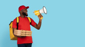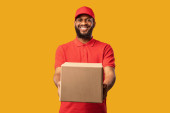 African Courier trzymając paczkę i zegar pozowanie na żółtym tle