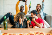 Portret szczęśliwej młodej latynoskiej pary cieszącej się kolacją w nowym domu. Koncepcja stylu życia i relacji.