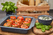 Pieczone pomidory i cukinia z sosem bazylii i śmietany w naczyniu do pieczenia