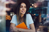 Radosna kobieta w kapeluszu w luźnych ubraniach czytająca książkę, stojąca przy szklanej ścianie na ulicy i odwracająca wzrok uśmiechnięta