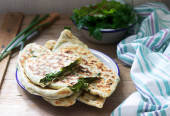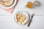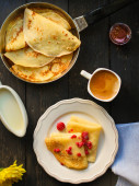 Naleśniki pokrzywy i szpinaku podawane z miodem i kawą. Styl rustykalny, ostrość selektywna.