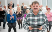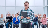 Mówca w pokoju z publicznym uśmiechem przed kamerą