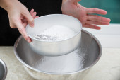 Gotowanie pieczenia. Gotować przesiewa mąkę.