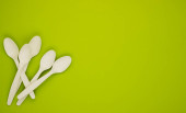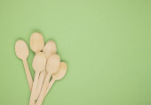 Ekologiczne jednorazowe zastawy stołowe wykonane z drewna bambusowego i papieru na zielonym tle. Zasłonięte łyżki rozrzucone na stole. Koncepcja zero odpadów. Zachowanie czystości przyrody