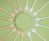 Zdjęcie "Ekologiczne jednorazowe zastawy stołowe wykonane z drewna bambusowego i papieru na zielonym tle. Zasłonięte łyżki rozrzucone na stole. Koncepcja zero odpadów. Zachowanie czystości przyrody" może być wykorzystywane do celów osobistych i komercyjnych zgodnie z warunkami zakupionej licencji Royalty-free. Obraz jest dostępny do pobrania w jakości wysokiej rozdzielczości do 5760x3840.