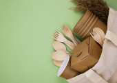 Zdjęcie "Ekologiczne jednorazowe zastawy stołowe wykonane z drewna bambusowego i papieru na zielonym tle. Zasłonięte łyżki rozrzucone na stole. Koncepcja zero odpadów. Zachowanie czystości przyrody" może być wykorzystywane do celów osobistych i komercyjnych zgodnie z warunkami zakupionej licencji Royalty-free. Obraz jest dostępny do pobrania w jakości wysokiej rozdzielczości do 5760x3840.