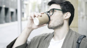 Przystojny elegancki ubrany mężczyzna trzyma filiżankę kawy na świeżym powietrzu