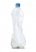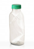 puste butelki z tworzyw sztucznych w papierowej torebce na białym tle.