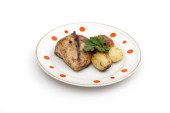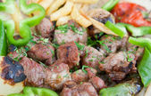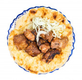 kuchnia gruzińska - grillowana wieprzowina shashlik na białym talerzu odizolowana na białym tle