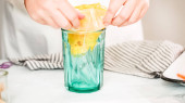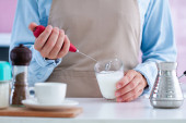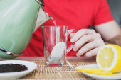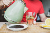 Mężczyzna przy śniadaniu przygotowuje sobie gorącą herbatę w szklanej filiżance - dodaje paczkę zielonej herbaty
