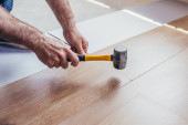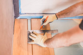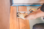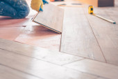 Pracownik instaluje podłogę laminowaną podczas prac wykończeniowych