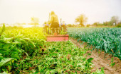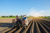 Zdjęcie "Rolnik jeździ traktorem przez pole uprawne ziemniaków. Przetwarzanie i uprawa gleby. Poprawa jakości gleby w celu umożliwienia przedostania się wody i powietrza do korzeni. Rolnictwo rolnicze" może być wykorzystywane do celów osobistych i komercyjnych zgodnie z warunkami zakupionej licencji Royalty-free. Obraz jest dostępny do pobrania w jakości wysokiej rozdzielczości do 5760x3840.